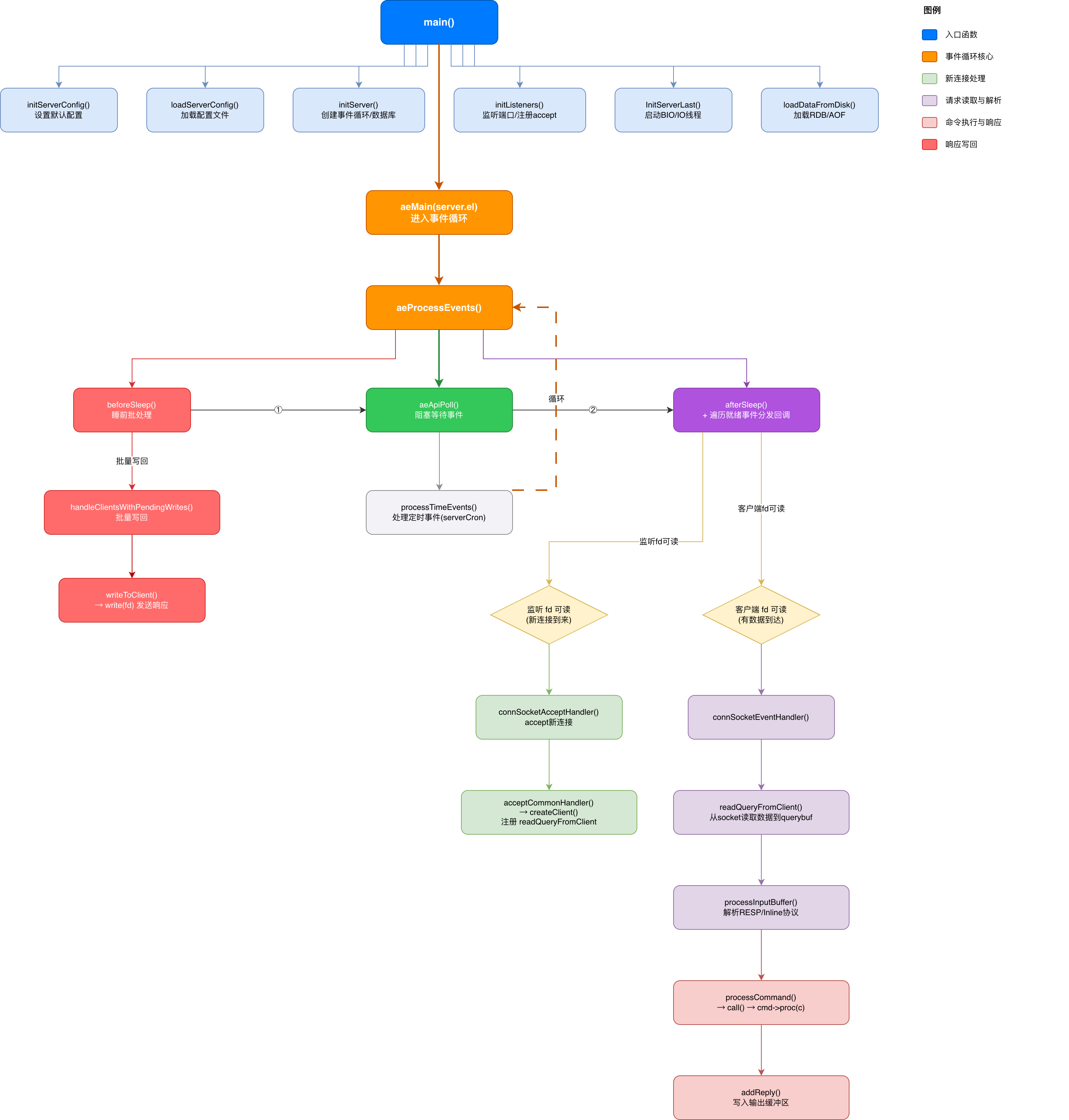 main()函数出发,完整梳理 Redis 服务器的启动、事件循环、连接建立、请求读取、协议解析、命令执行、响应写回的全链路流程。