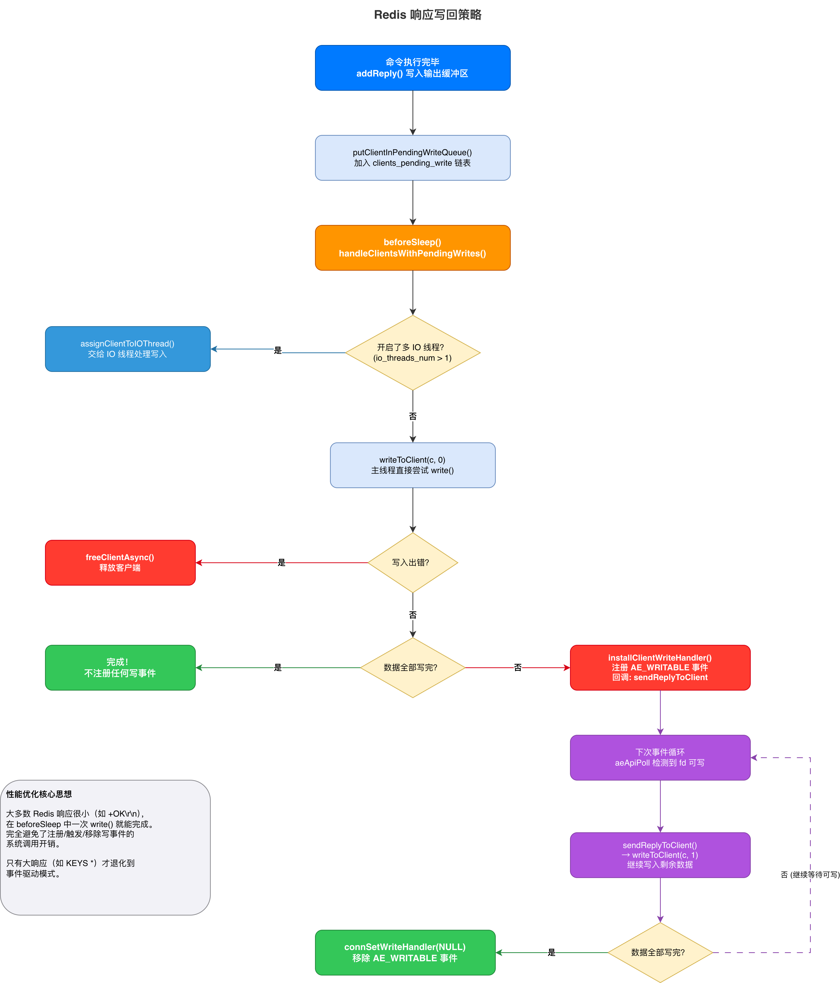 +OK\r\n),在beforeSleep中一次write()就能完成。这样就完全避免了注册/触发/移除写事件的系统调用开销。只有大响应才退化到事件驱动模式。