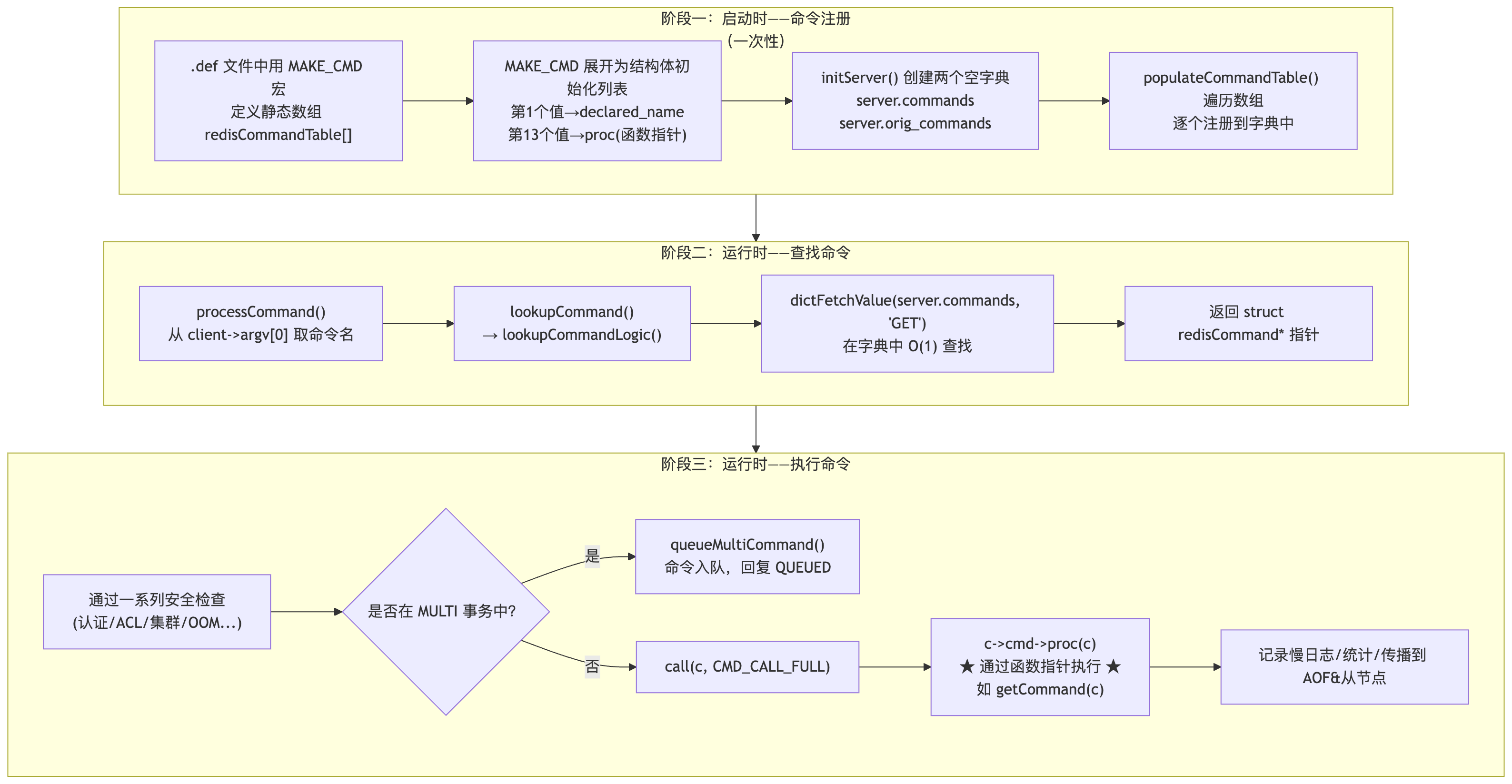 Redis 利用 函数指针 + 哈希表 实现了一个高效的命令分发系统。所有命令在编译时就通过宏定义绑定了名称和处理函数,启动时注册到字典中,运行时通过 O(1) 的字典查找定位到命令结构体,再通过函数指针直接调用——整个过程没有任何 if-else 或 switch-case 分支判断,极其高效。